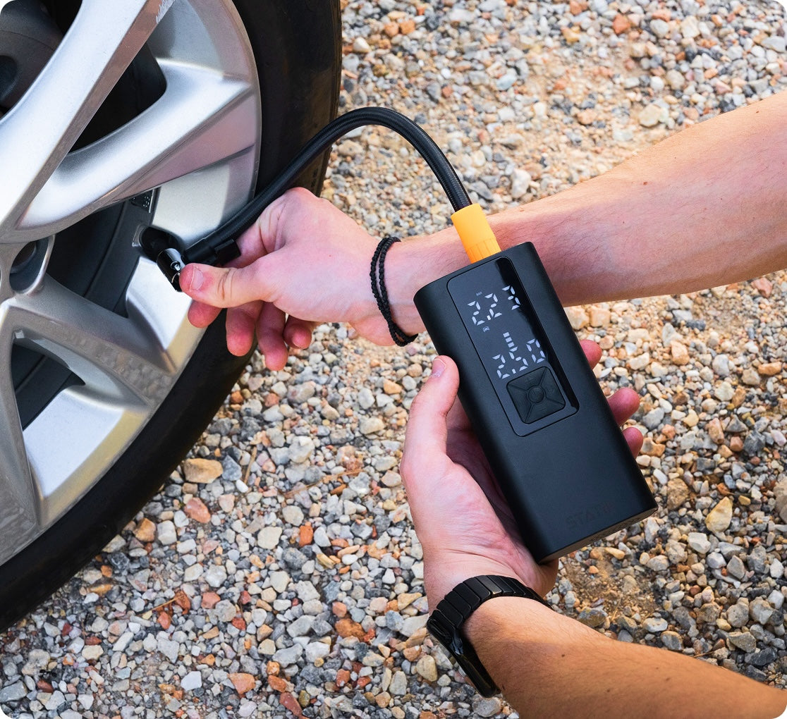 Portable rechargeable air pump with 150 PSI and built-in power bank. Inflate car tires, bikes, and more in minutes.
