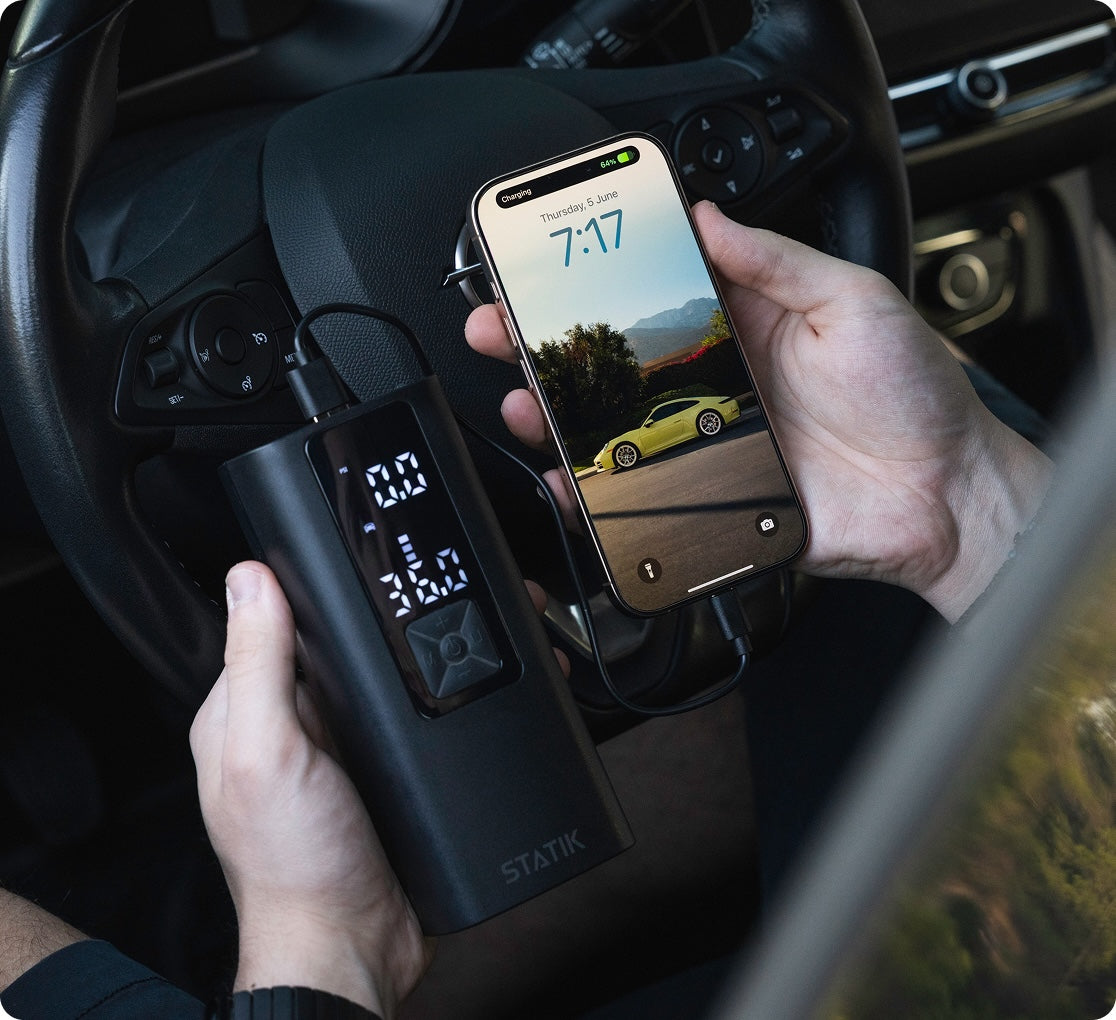 Power Bank Built In. Tire Hero doubles as a power bank to charge up your phone or tablet in an emergency.