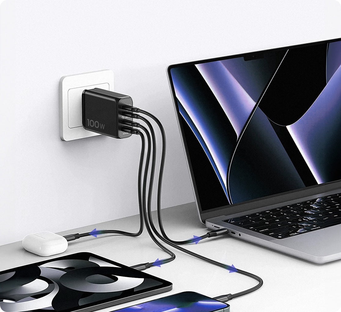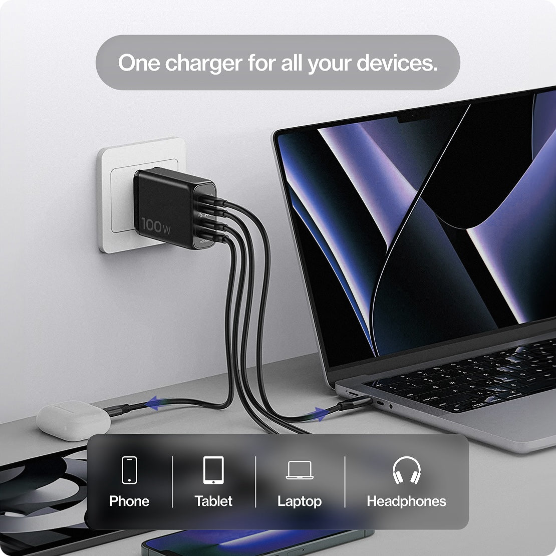 100W GaN charger with 3 USB‑C and 1 USB‑A port. Fast‑charge up to four devices at once, two MacBooks to ~55% in 30 minutes.