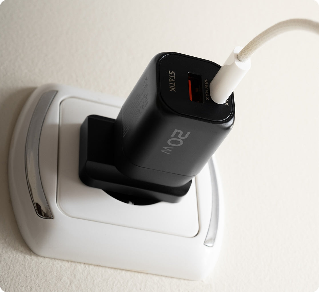From your bedside table to your carry-on, the Statik 20W GaN Power Adapter gives you fast, efficient power with none of the bulk. With two ports (USB-C + USB-A) you can top off your phone and earbuds at once. Its GaN design stays cool, handles fluctuating voltages , and protects against overheating, overcharge, and short circuits. The foldable prongs and compact size make it perfect for travel, yet powerful enough that you won’t need a drawer full of wall adapters.
