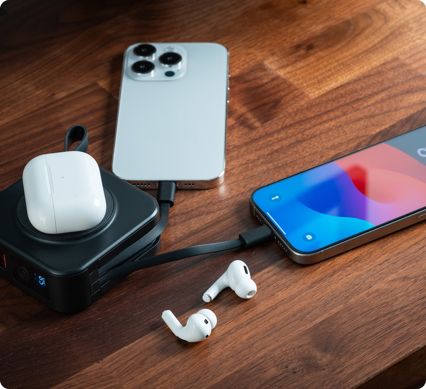 SmartCharge comes with USB-C and Lightning cables built right in. So you can charge your phone, tablet, earbuds, or even your laptop without digging for cords. Wherever you travel, your charging setup is already packed.