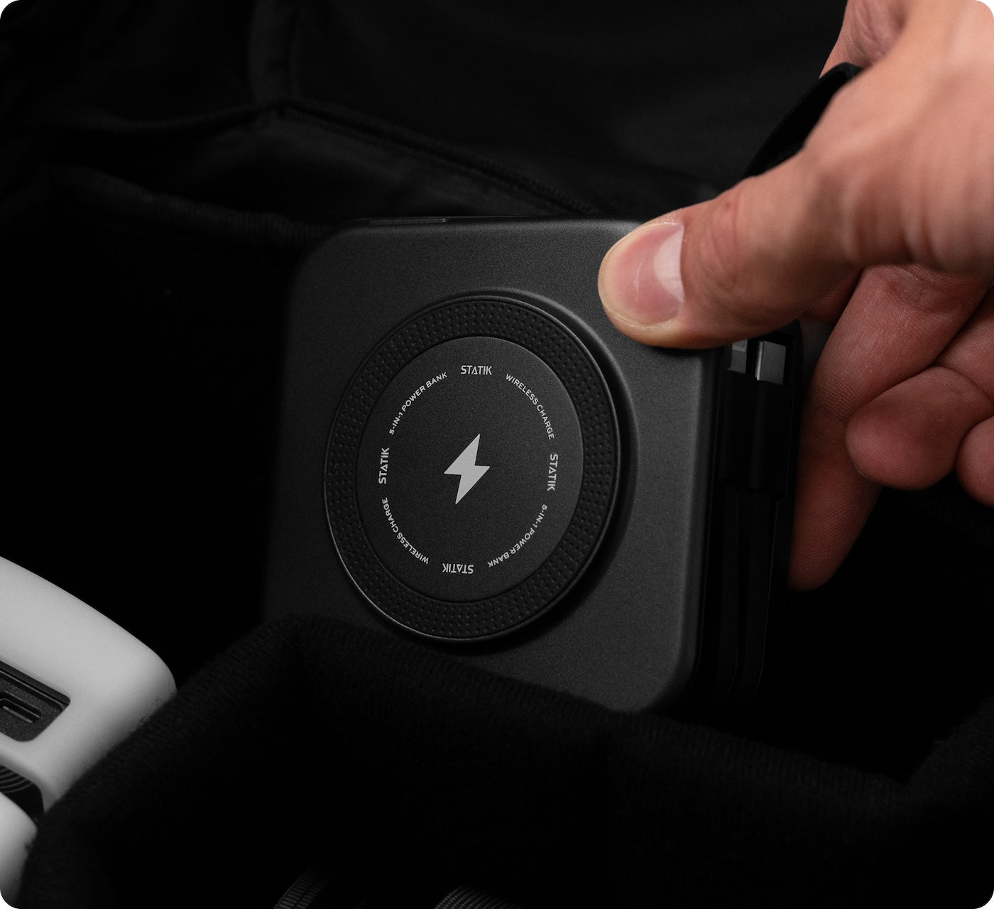 Pocket 10K power bank with built‑in cables. Charge your device from 0–50% in ~25 minutes.