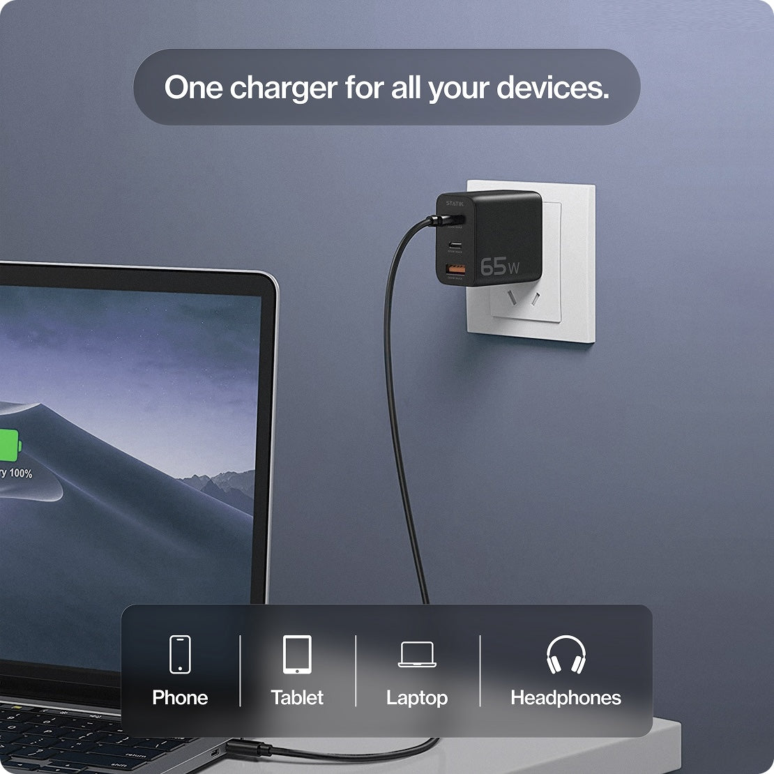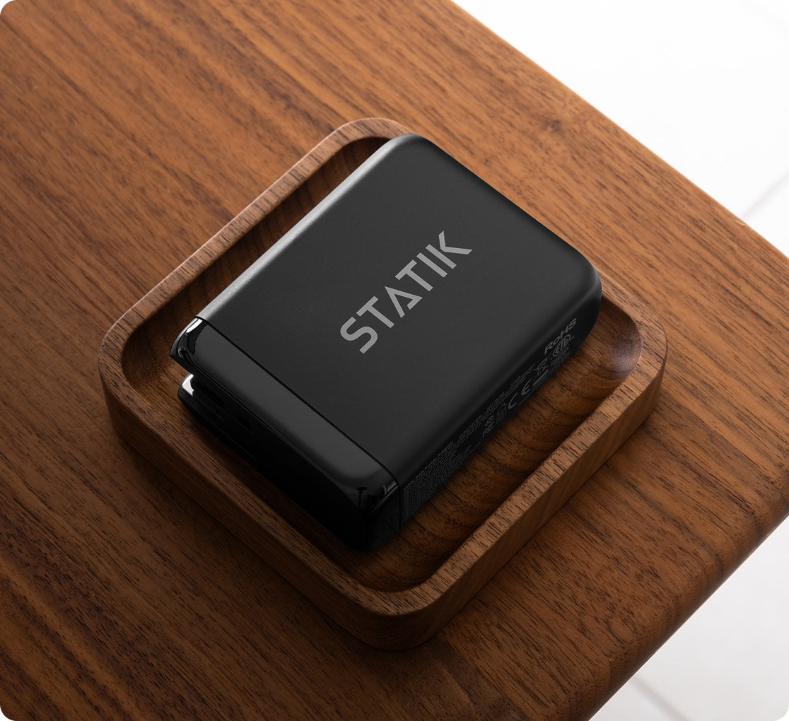 From your laptop and tablet at home to your phone and earbuds on the road, the Statik 65W GaN Power Adapter has you covered with three ports. With 65 watts of GaN-powered punch, dual USB-C and one USB-A port let you juice up your MacBook Pro, phone, and buds all at once. Folding prongs, global voltage, and built-in safety features keep things compact, reliable, and travel-friendly. Say goodbye to jumbling together multiple bricks—this charger replaces the stack with one sleek, powerful unit.