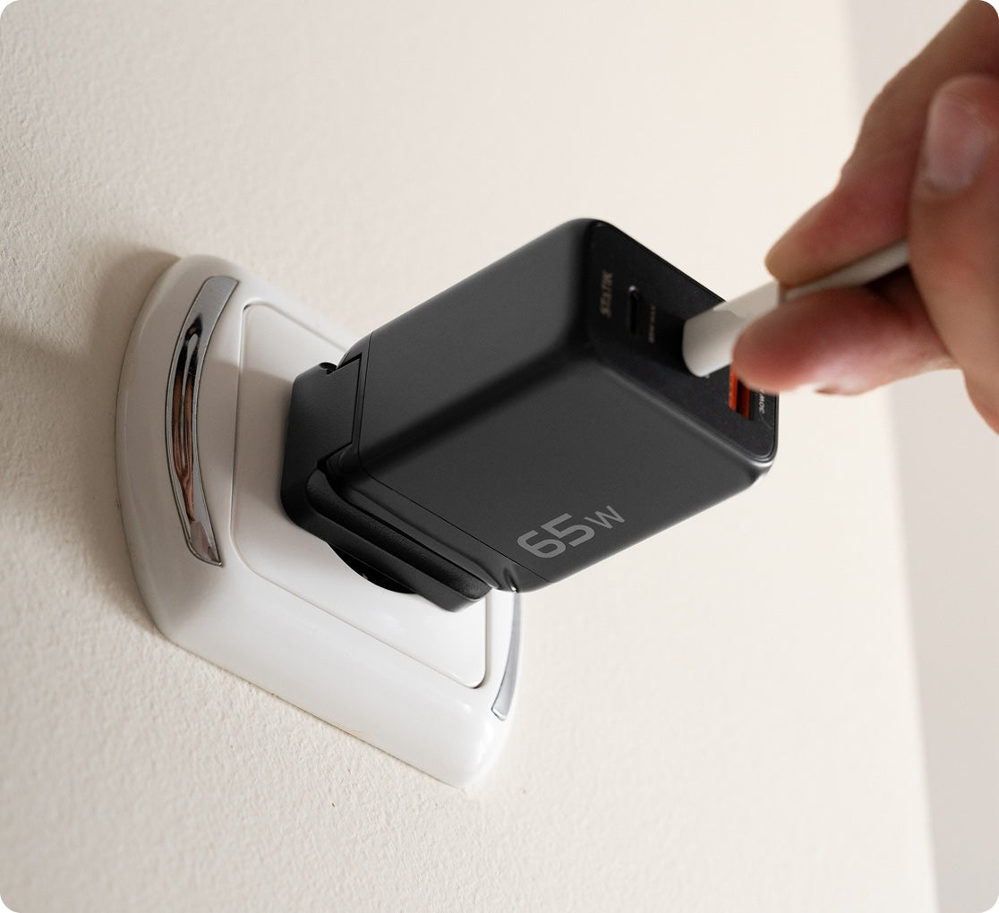 The 65W GaN Charger is built to replace multiple adapters. With two USB-C ports and one USB-A, you can power a laptop, phone, and earbuds at the same time without slowing down. One adapter, three devices, endless convenience.