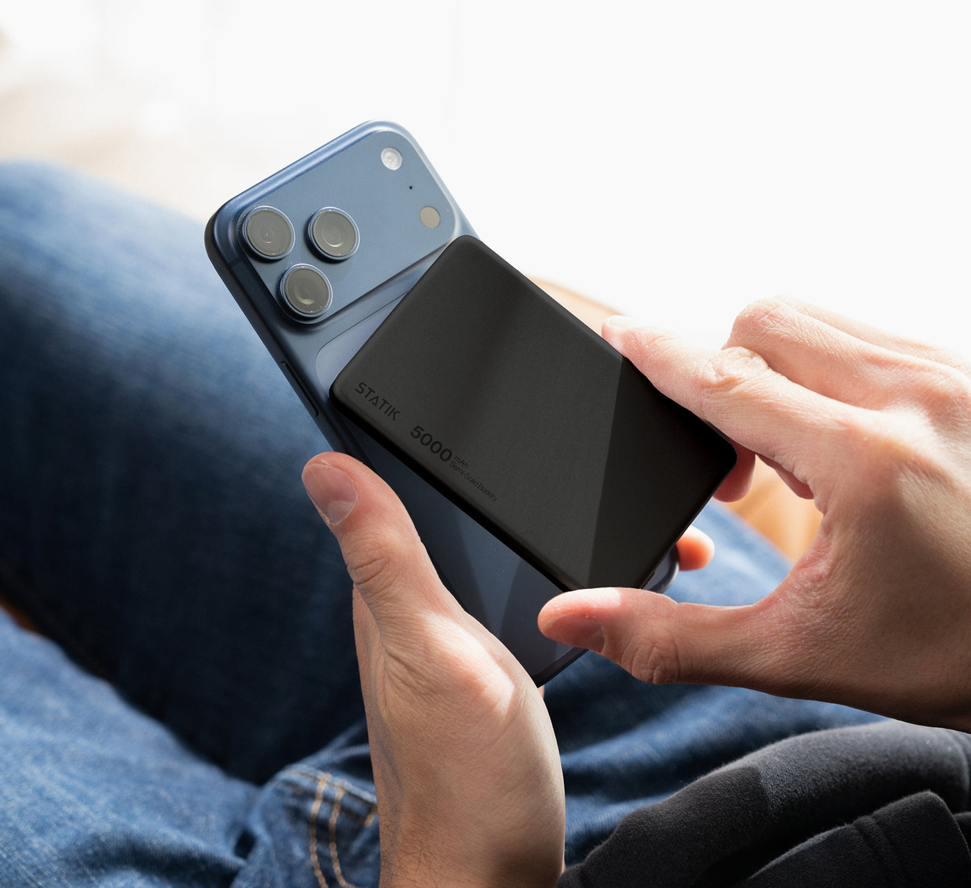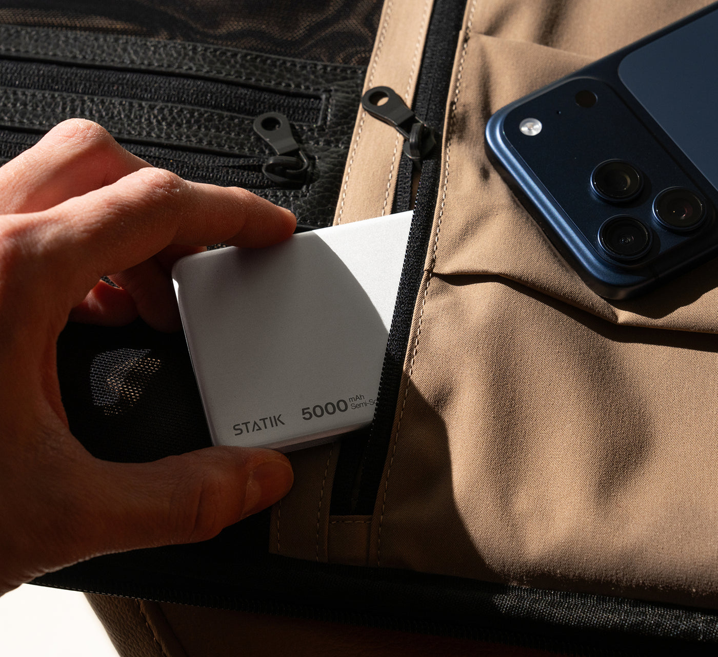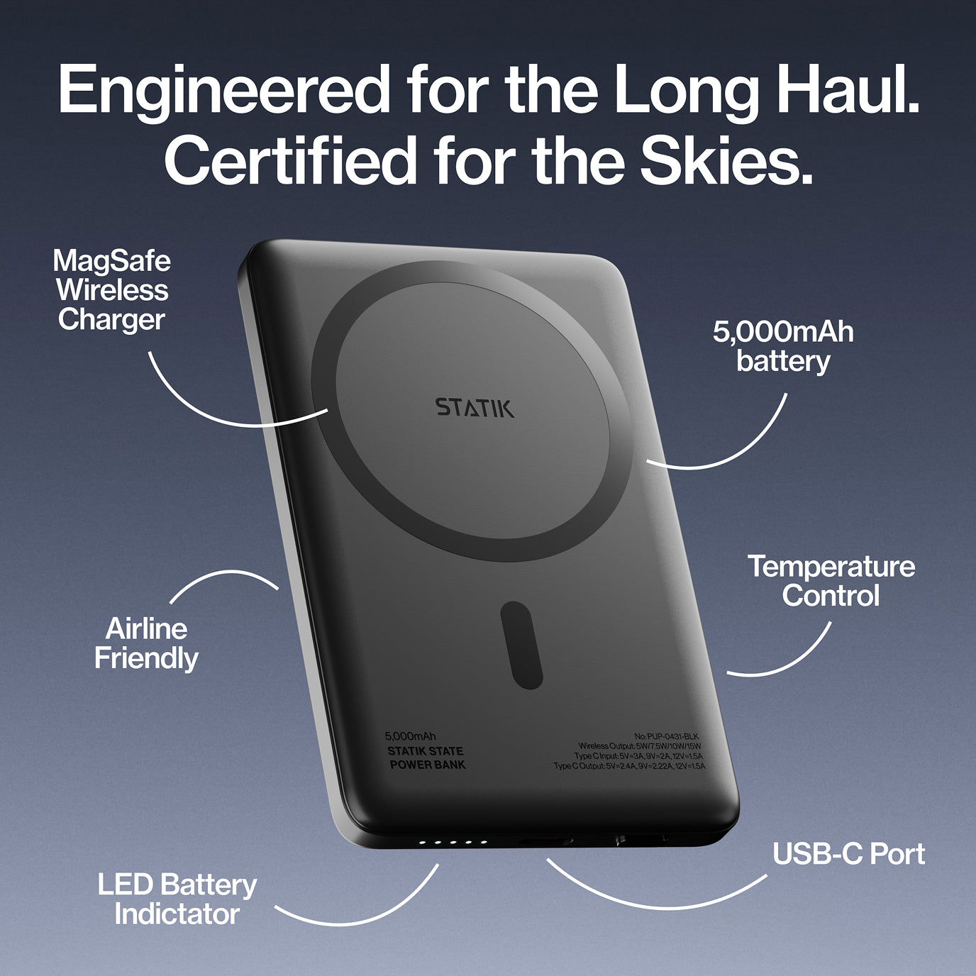 The Statik State Power Bank is a compact 5,000 mAh charger with advanced semi-solid battery technology that makes it far safer and longer-lasting than traditional power banks. With 15W MagSafe wireless charging and 20W USB-C fast charging, it’s perfect for powering up your phone, earbuds, or smartwatch on the go. Slip it in your bag for commutes, keep it by your bed, or take it while traveling for safe, reliable charging anywhere.